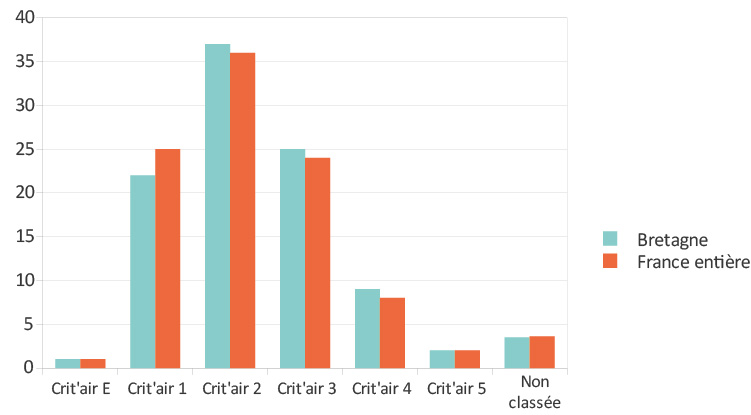 Au 1er janvier 2021, 11 % des voitures du parc breton sont éligibles aux vignettes crit’air 4 et 5 (10 % en France). Ce sont des véhicules diesel et assimilés mis en circulation entre le 1er janvier 1997 et le 31 décembre 2005.
